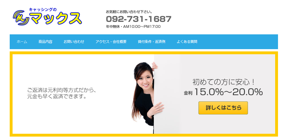 北九州市八幡西区黒崎に実店舗があり、対面で相談できるのが特徴です。創業以来の実績を活かした柔軟な審査基準を採用しており、他社からの借入状況よりも返済能力を重視しています。